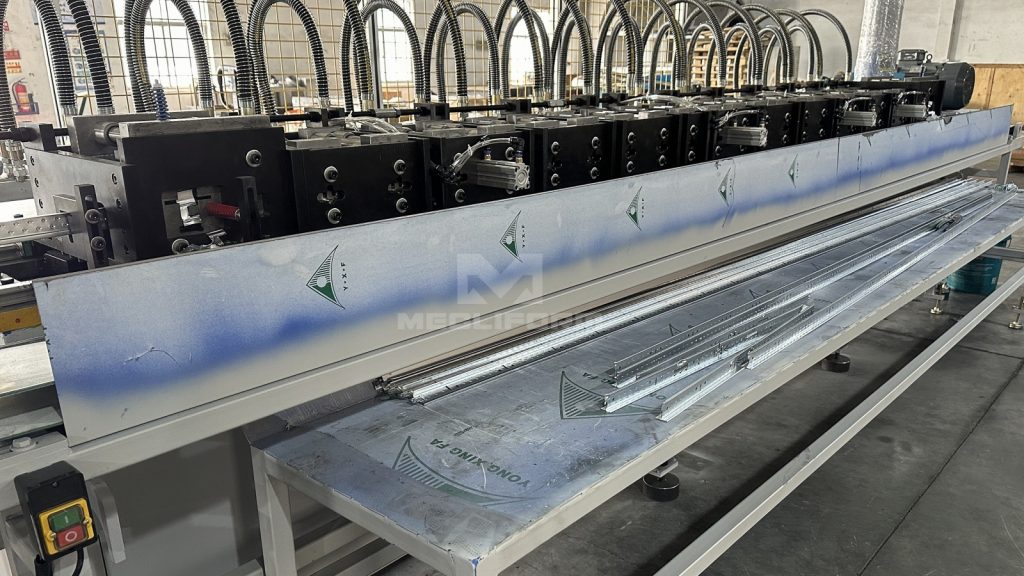 Punching & Cutting unit is used to punch holes and cutting off after roll forming. It typically consists of a series of metal tools that are propelled with force through the material to create the desired hole or shape, meanwhile cutting to length. 冲孔切断一体机是用于型材辊压成型后的冲孔及定尺切断的专用设备。该单元通常由多组金属模具组成,通过强力冲压在被加工材料上形成所需孔型或特定形状,同时完成型材的精准定长切割。