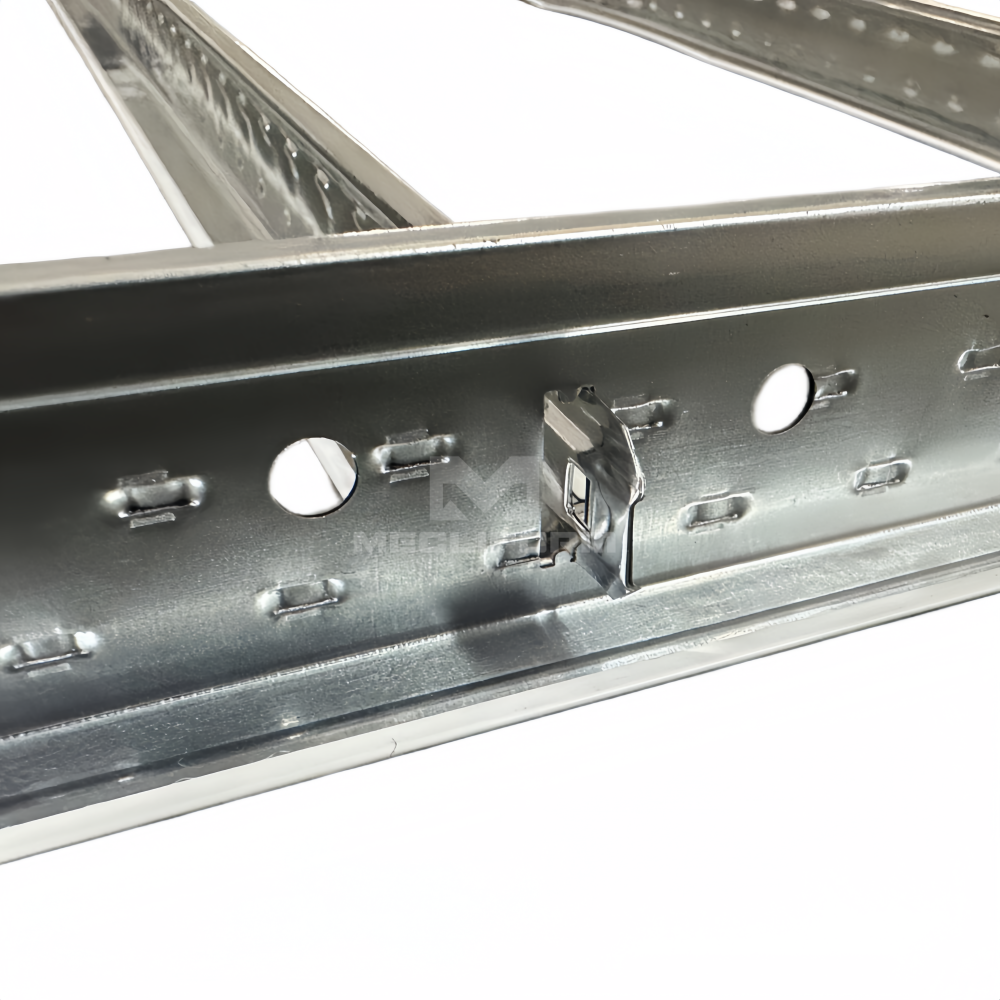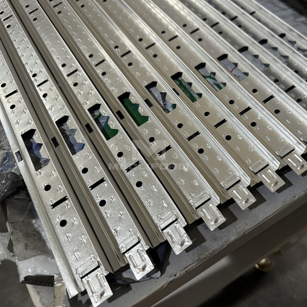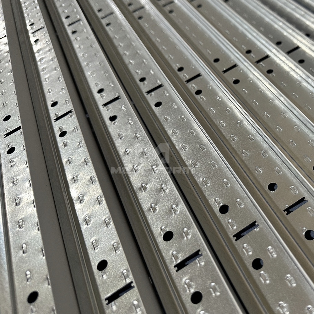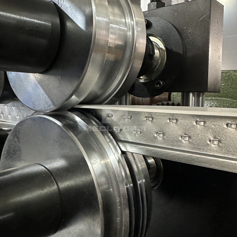 Punching & Cutting unit is used to punch holes and cutting off after roll forming. It typically consists of a series of metal tools that are propelled with force through the material to create the desired hole or shape, meanwhile cutting to length. 冲孔切断一体机是用于型材辊压成型后的冲孔及定尺切断的专用设备。该单元通常由多组金属模具组成,通过强力冲压在被加工材料上形成所需孔型或特定形状,同时完成型材的精准定长切割。
