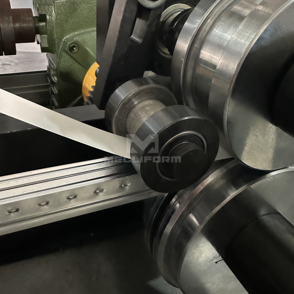 Roll former is used to create uniform, continuous bends in metal materials. It works by passing a strip of material through a series of rollers that gradually bend and form the material into its desired shape. 辊压成型机用于在金属材料上形成均匀、连续的弯曲。其工作原理是将金属带材依次通过多组轧辊,通过渐进式弯曲使材料成型为所需形状。