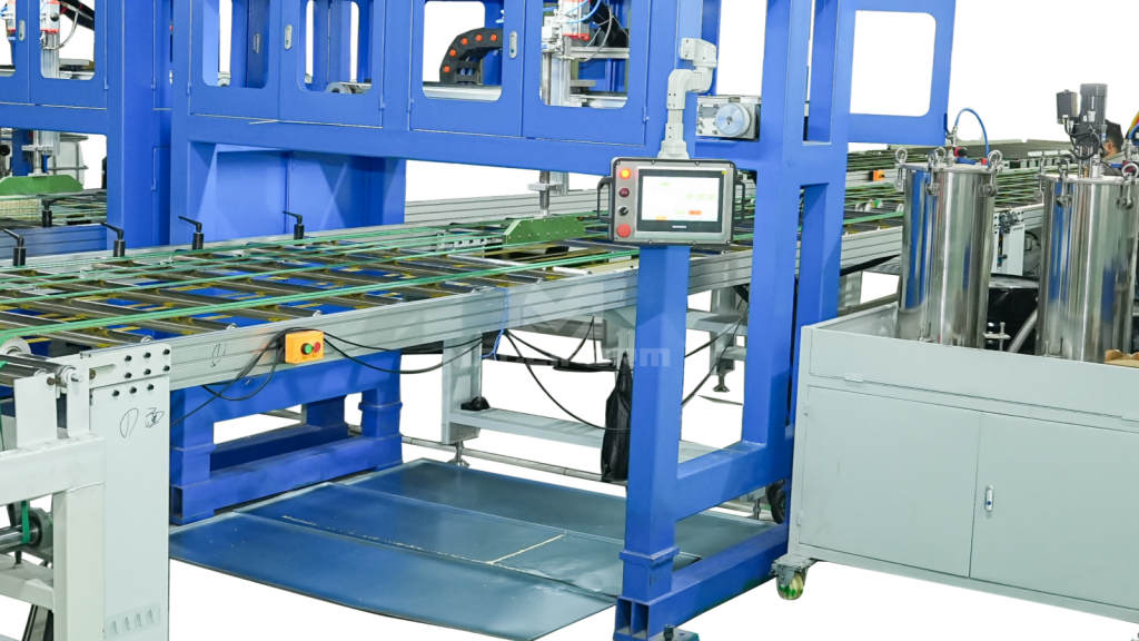 Auto assembly unit consists of a series of equipment, including glue sprayer, alignment unit, combination unit, turn-over unit, auto stacking unit, and cold presses. 自动组装机构由多台设备集成构成,包含淋胶机、定位装置、合板机构、翻转机构、自动堆垛装置及冷压机等成套设备。