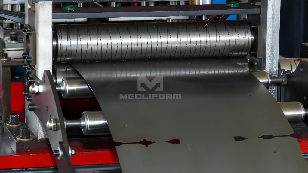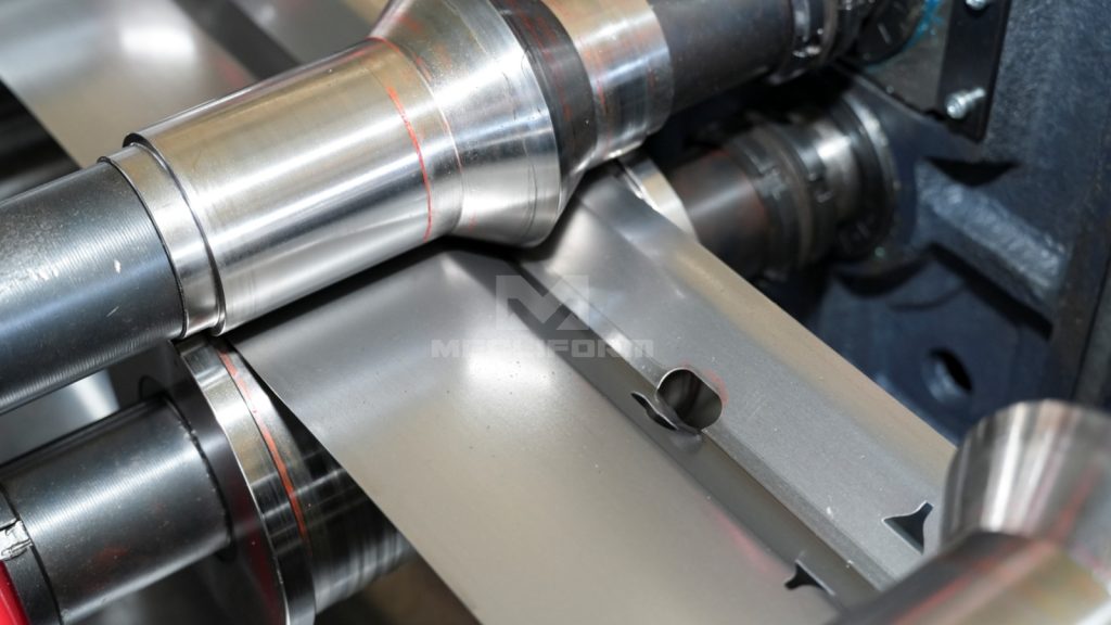 Punching unit is used to punch holes before roll forming. It typically consists of a metal tool that is propelled with force through the material to create the desired hole or shape. 冲孔装置用于在辊压成型前进行冲孔加工。该装置通常由冲孔模具构成,通过机械冲床或液压动力,从而形成所需的功能孔或特定形状。