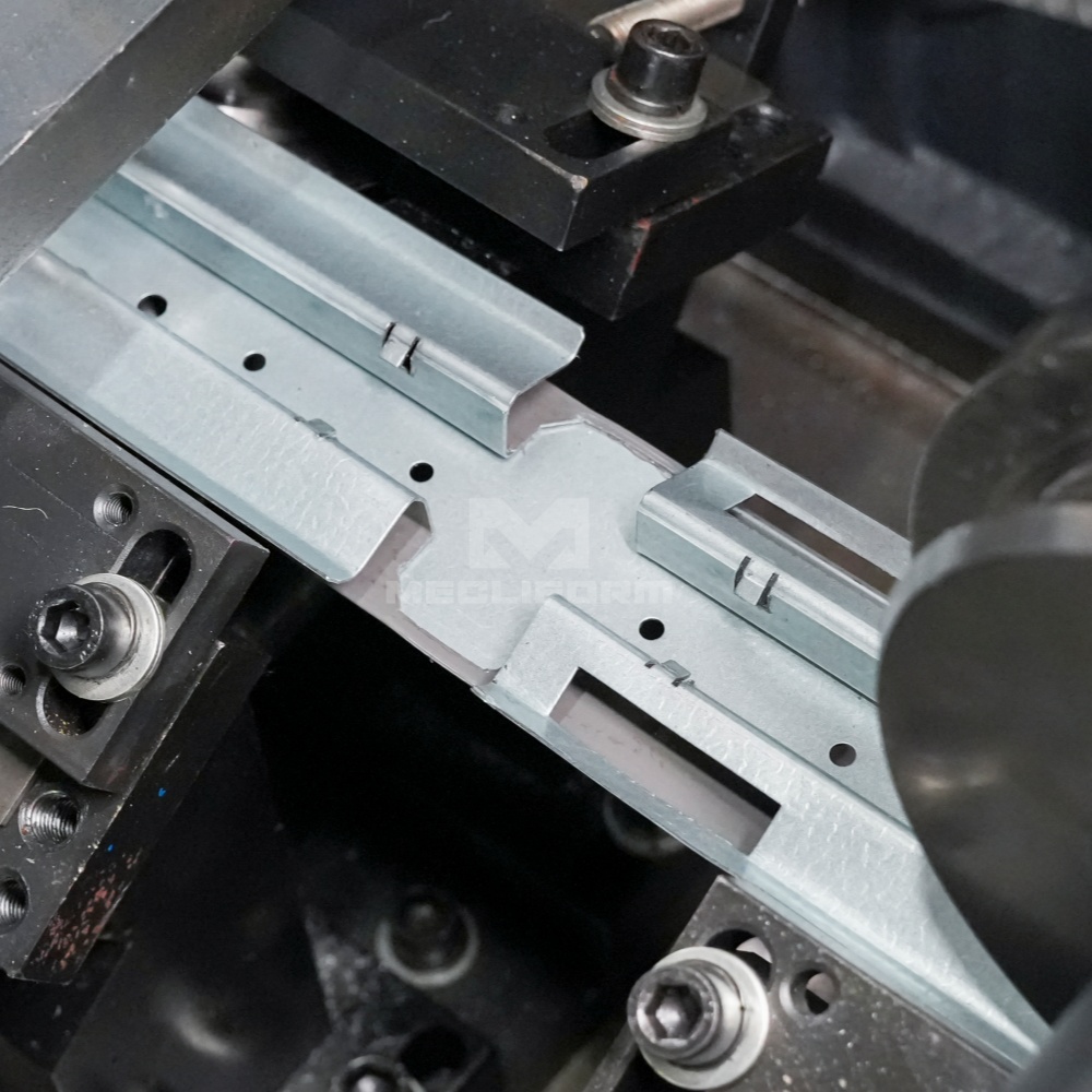 Punching unit is used to punch holes before roll forming. It typically consists of a metal tool that is propelled with force through the material to create the desired hole or shape. 冲孔装置用于在辊压成型前进行冲孔加工。该装置通常由冲孔模具构成,通过机械冲床或液压动力,从而形成所需的功能孔或特定形状。