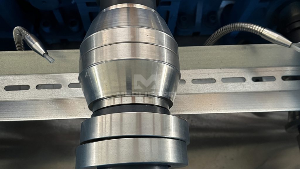 Roll former is used to create uniform, continuous bends in metal materials. It works by passing a strip of material through a series of rollers that gradually bend and form the material into its desired shape. 辊压成型机用于在金属材料上形成均匀、连续的弯曲。其工作原理是将金属带材依次通过多组轧辊,通过渐进式弯曲使材料成型为所需形状。