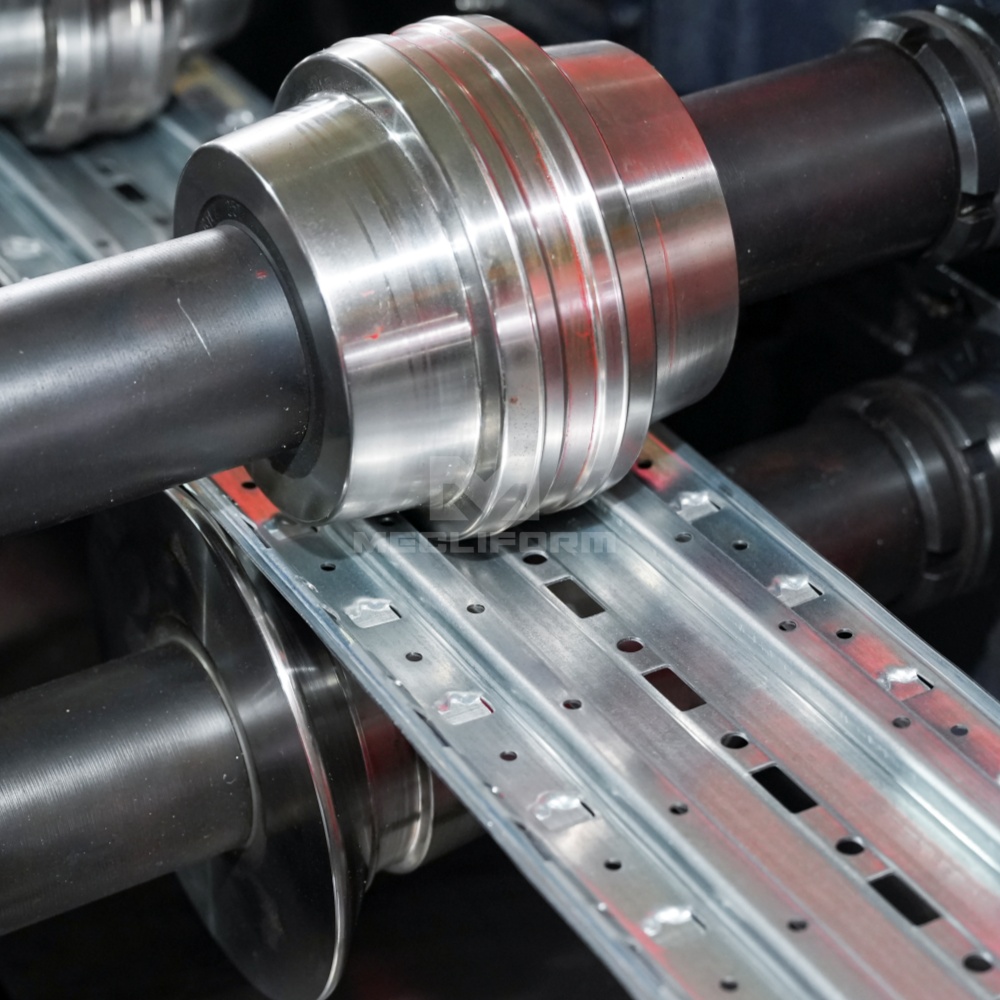 Punching unit is used to punch holes before roll forming. It typically consists of a metal tool that is propelled with force through the material to create the desired hole or shape. 冲孔装置用于在辊压成型前进行冲孔加工。该装置通常由冲孔模具构成,通过机械冲床或液压动力,从而形成所需的功能孔或特定形状。