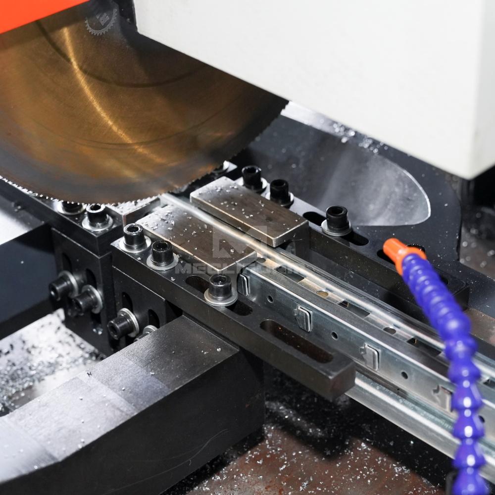 Saw cutting unit is used for cutting closed profiles. This unit typically consists of a sharp disc that rotates at high speed to make precise and clean cuts through the material. 锯切机构专用于闭口型材的切割加工,该装置通常配备高速旋转的锋利圆锯片,可实现材料的精密切割并确保切口光洁平整。